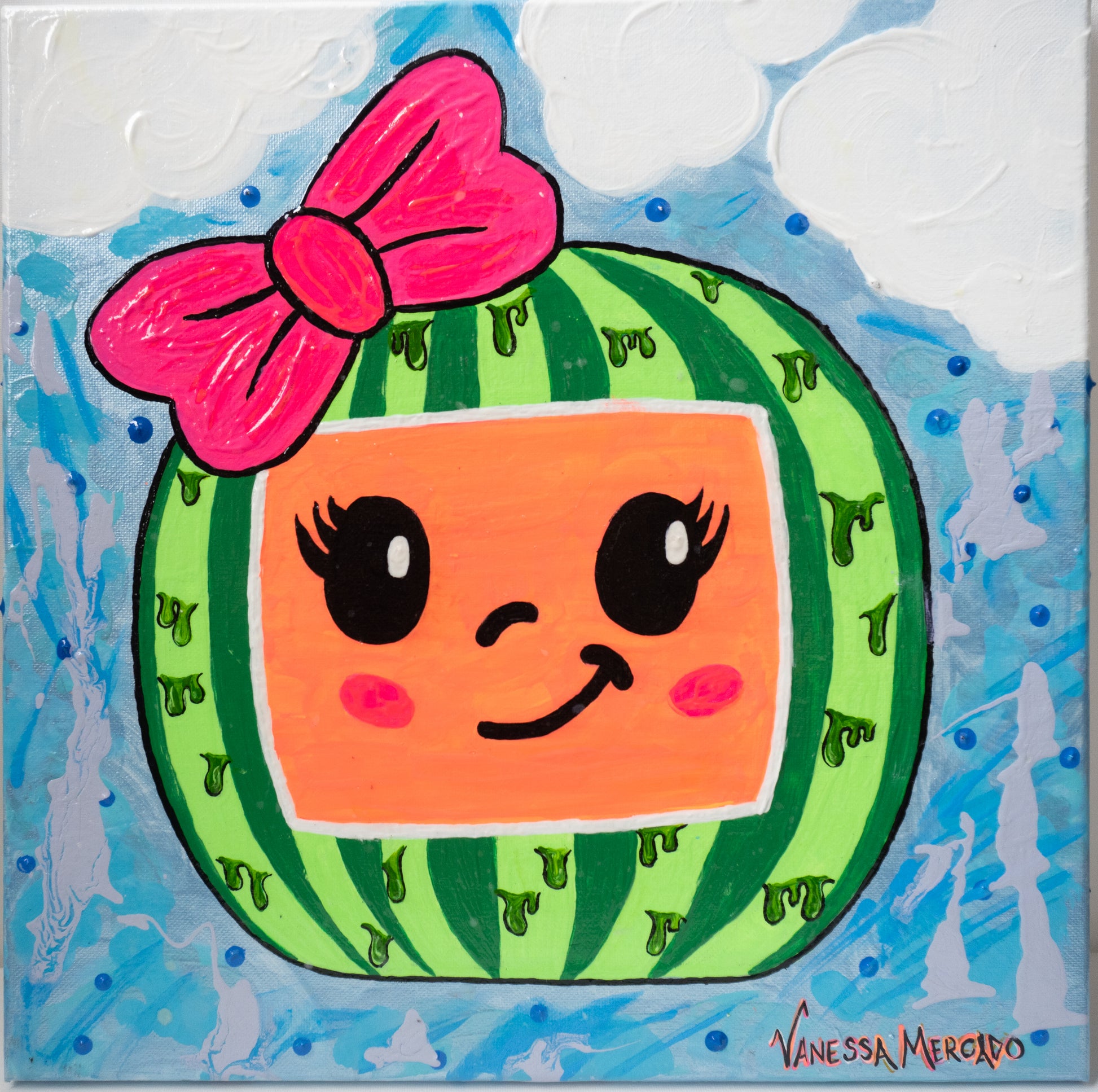 This original is a drip style CocoMelon Canvas, for that girly coco melon fan. The background has different shades of blue along with bright white clouds. This is a Handmade item.